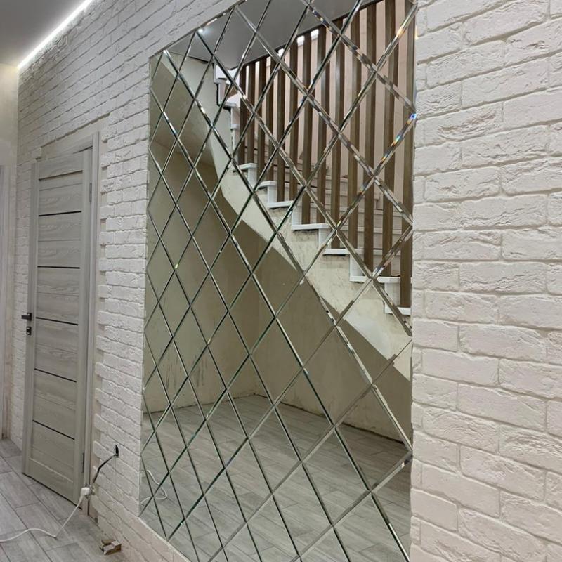 Использована квадратная серебристая зеркальная плитка размером 18х18.