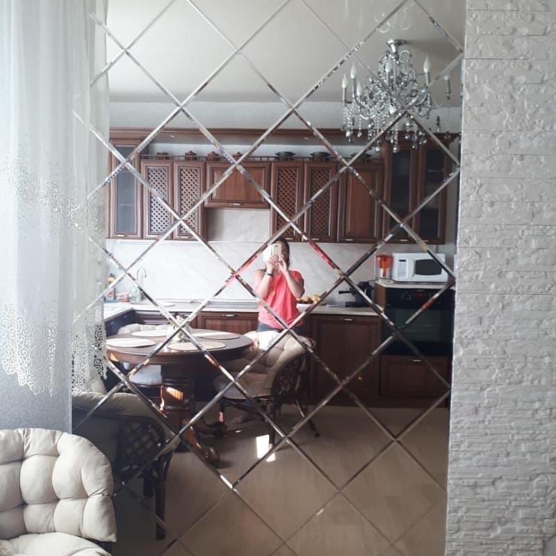 Использовалась серебристая зеркальная плитка формы "вытянутый ромб".