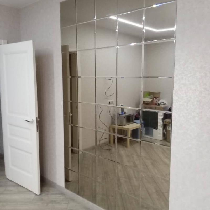 • Зеркальное панно в салоне, Москва, серебряная глянцевая плитка квадратной формы